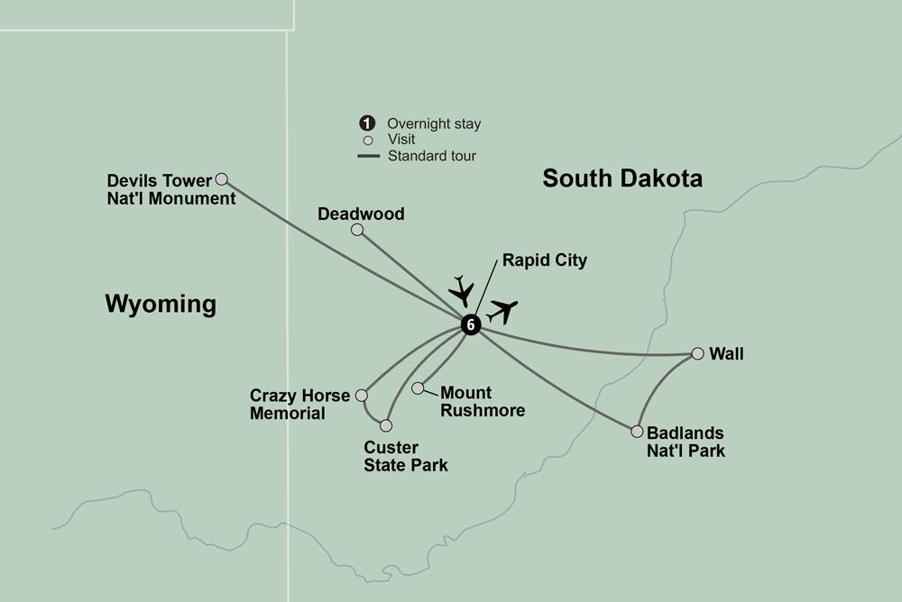 Get your bearings at the Geographic Center of the Nation, marking the middle of the U.S. Cross into Wyoming and view the first national monument, Devils Tower. Stand in awe before this lofty monolith, perhaps hiking the 1.3-mile Tower Trail around the base. Although famous as the backdrop in Close Encounters of the Third Kind, the tower is also sacred to many local tribes. This evening, join your fellow travelers for dinner as the end of your South Dakota adventure draws near.