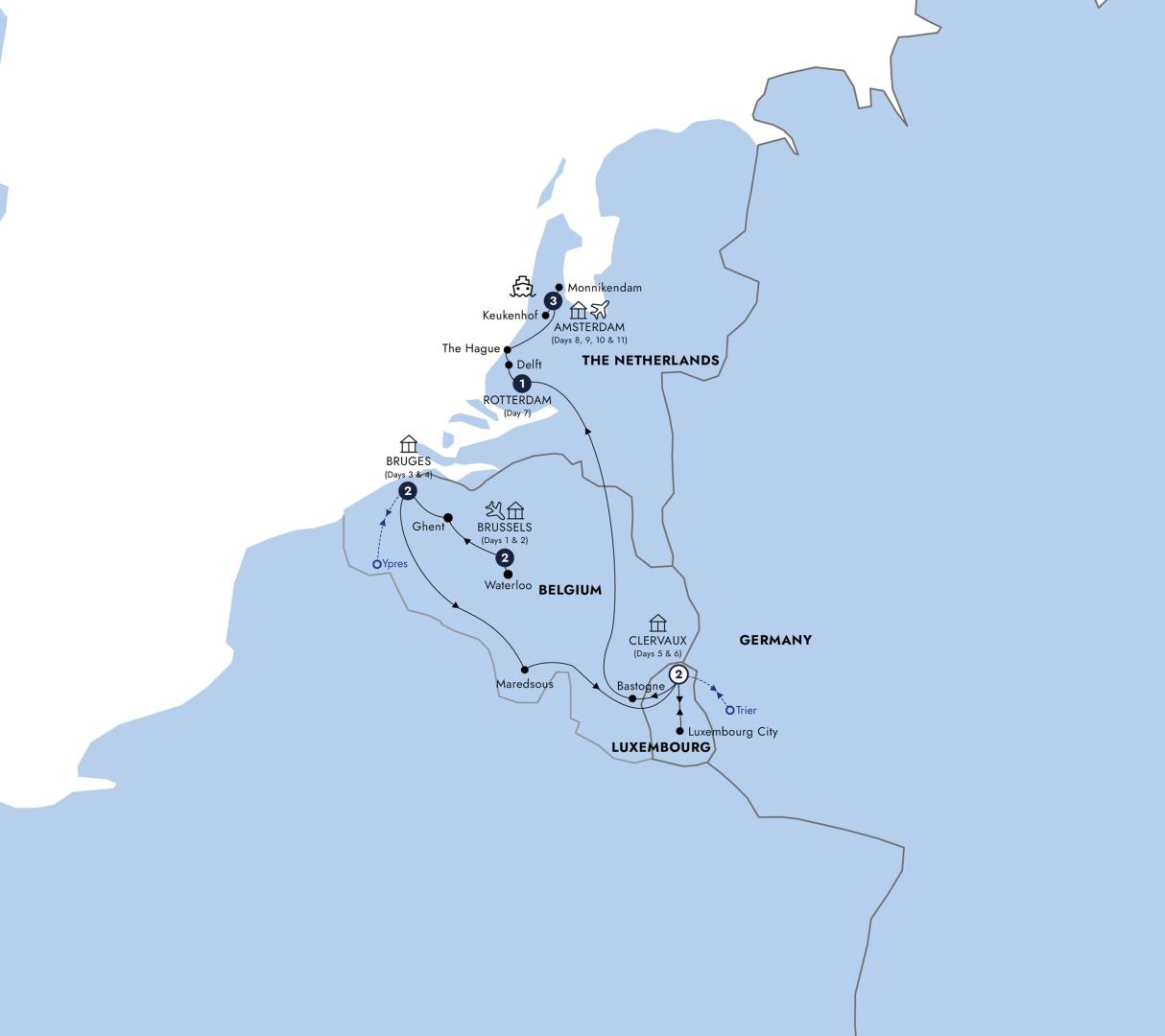 Airport transfers depart Brussels airport for your centrally-located hotel. After checking in, the afternoon is yours to relax. Join your Travel Director for a visit to the cheeky Manneken Pis statue and a leisurely stroll around the Grand Place, voted the most beautiful square in Europe. Your delightful first evening also includes dinner at a local restaurant in the heart of the Old Town, with an opportunity to mingle with your fellow travelers.